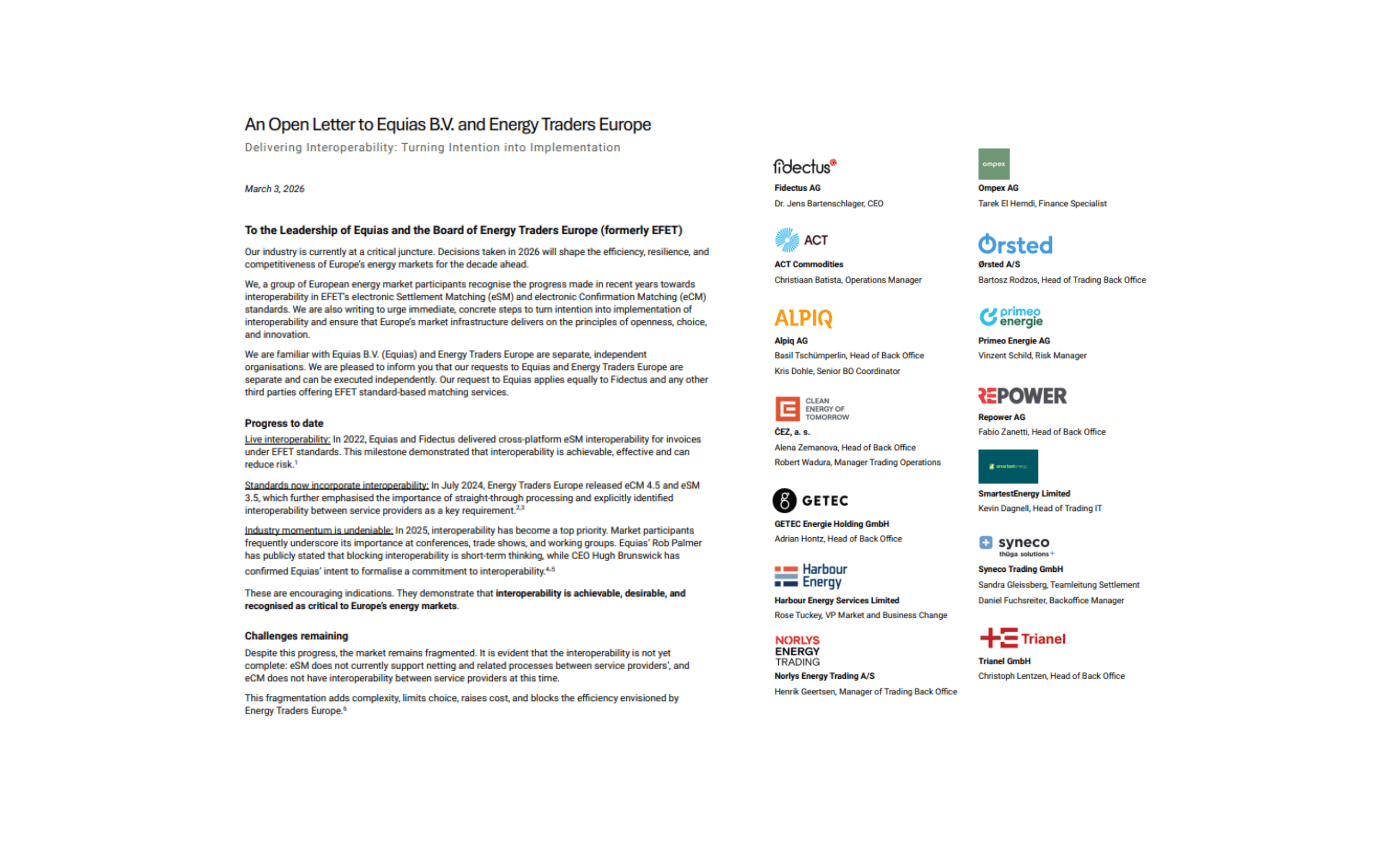 Interoperabilität umsetzen: Ein offener Brief an Energy Traders Europe und Equias B.V. Veröffentlicht: 3. März 2026 | Fidectus AG
